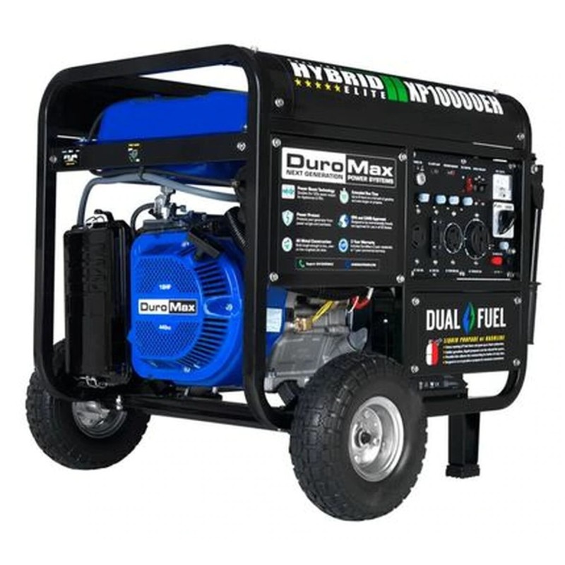 Be prepared for the big storm or any power outage with the flexibility of the DuroMax XP10000EH 10,000 Watt Hybrid Dual Fuel Generator. Adding the capability of being able to operate on Gasoline or Liquid Propane, you will be able to provide safe, reliable power when you need it while increasing your generator's runtime. By also operating on propane, the LPG fuel will not gum up or foul your generator's carburetor while still giving you quick, reliable starts every time. DuroMax Generators are perfect for any application where portable power is needed; whether it's because of a natural disaster or needed for camping in the woods, DuroMax will deliver. Powering this unit is an 18 Horsepower, DuroMax Over Head Valve Engine. This feeds the fully loaded power panel with a peak 10,000 watts and 8,000 constant watts of power. Also contained on the power panel is the RV Switch, Idle Control, Keyed Electric Start, Engine Shutoff Switch, Volt Meter, and Circuit Breakers. These units are EPA approved for safe use in U.S. National Parks thanks to the quiet exhaust with spark arrestor. The sound level of these generators is 72 dBA while running a load and drops down to 45 dBA while idle control is engaged with no load for an even quieter operation. DuroMax Generators are designed to help you stay safe and secure during any type of power outages; expected or unexpected. The DuroMax 10,000 Watt Hybrid Dual Fuel Generator was designed for reliable performance and safe operation. The user-friendly electric key start is as easy as starting a car. Simply turn the key and this Generator will start right up. Forgot to charge your battery? No worries, it is also equipped with a recoil start in case of the battery being drained. Solid-Fill tires are also standard, they will never run flat, and high leverage handles that make it easy to transport over every terrain.